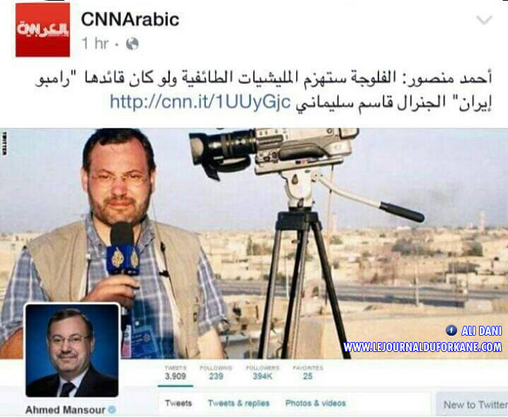 Le présentateur « vedette », attrapé il y a quelques semaines en Allemagne; Ahmed el-Mansour, écrit sur son compte Tweeter : » Falloujah vaincra les milices sectaires même si leur commandant est le « Rambo iranien » Qassem Souleimani … «