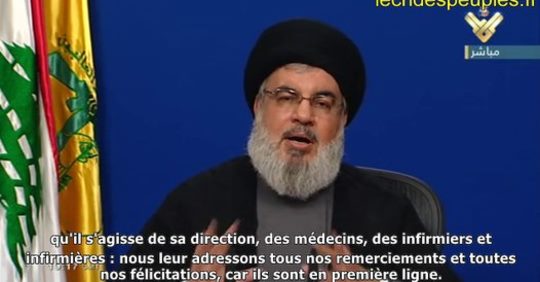 Discours du Secrétaire Général du Hezbollah, Sayed Hassan Nasrallah, le 13 mars 2020, consacré presque exclusivement à la crise sanitaire mondiale due au Covid-19 et aux mesures que chaque individu