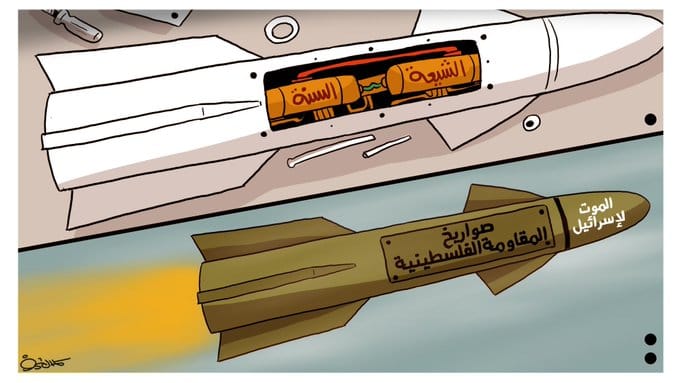 Dessin de l’artiste yéménite Kamal Sharf représentant un missile palestinien alimenté par la fusion de l’unité chiite-sunnite. Israel n’est bâti que sur la division et sera anéanti par l’alliance des