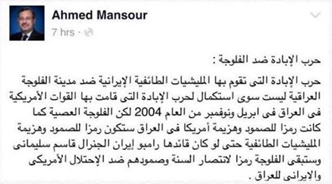 La chaine pro-sioniste Al-jazeera soutient Daesh à 100%. L'un de ses présentateur Ahmed el-Mansour écrit sur son compte Tweeter : "Génocide contre Falloujah" - "Falloujah vaincra les milices sectaires même