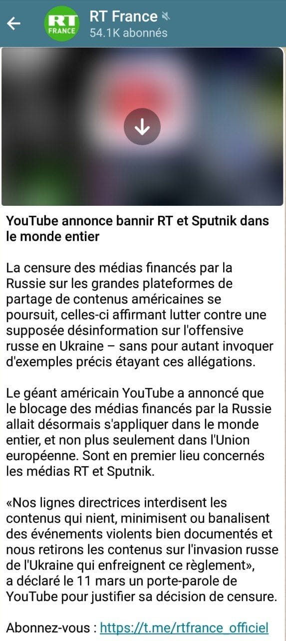 YouTube annonce bannir RT et Sputnik dans le monde entier La censure des médias financés par la Russie sur les grandes plateformes de partage de contenus américaines se poursuit, celles-ci