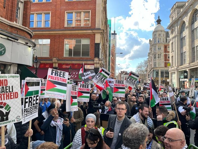 Devant l’ambassade d’Israël à Londres pour condamner la violence barbare d’Israël contre les Palestiniens à la mosquée Al-Aqsa, à Gaza et dans toute la Palestine occupée. Solidarité avec la résistance