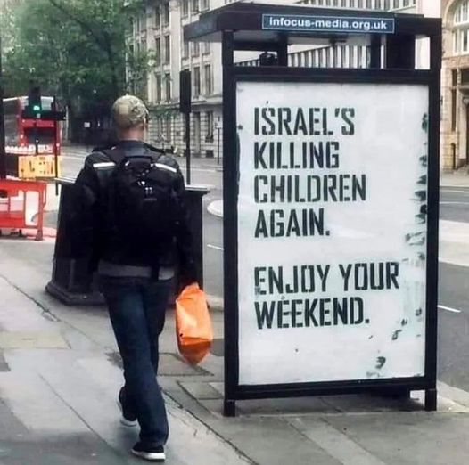 Panneau d’affichage « sauvage » à Londres : « Israël tue à nouveau des enfants. Bon week-end. » En France, suite aux jappements du CRIF, tous les moyens de la police auraient été mobilisés