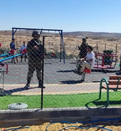 Les colons israéliens s’emparent d’un terrain de jeu pour les enfants palestiniens et sont protégés par l’armée israélienne. Cette photo est tellement révélatrice d’un régime malade et moralement corrompu défini