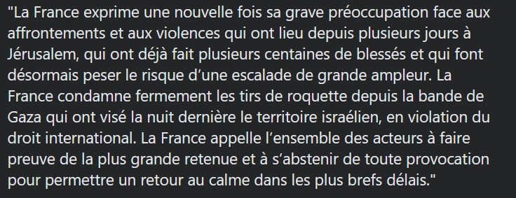 Aucun mot, aucune pensée pour les victimes Palestiniennes suite aux frappes israéliennes. Ce gouvernement, comme les précédents, est lache et hypocrite. Communiqué officiel du ministère des affaires étrangères français à