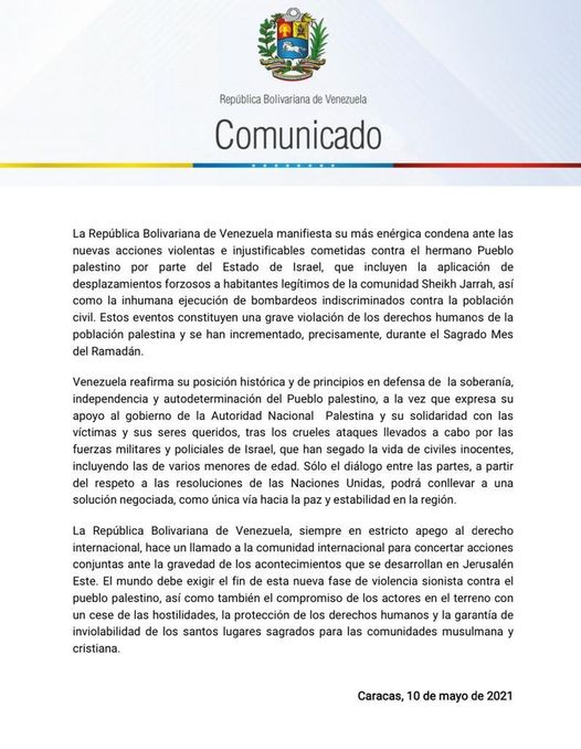 Le Venezuela condamne les nouvelles actions violentes menées contre le peuple palestinien par Israël et lance un appel à la communauté internationale, réaffirmant sa position historique de défense de la