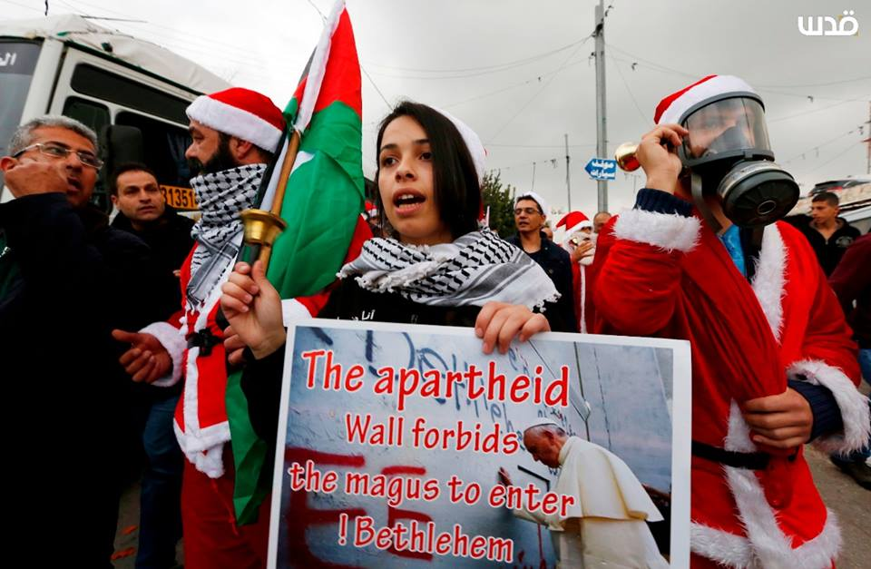 Les Palestiniens prennent part à un rassemblement à Bethléem, dans le sud de la Cisjordanie, pour protester contre les restrictions imposées par les mouvements israéliens, aujourd'hui.