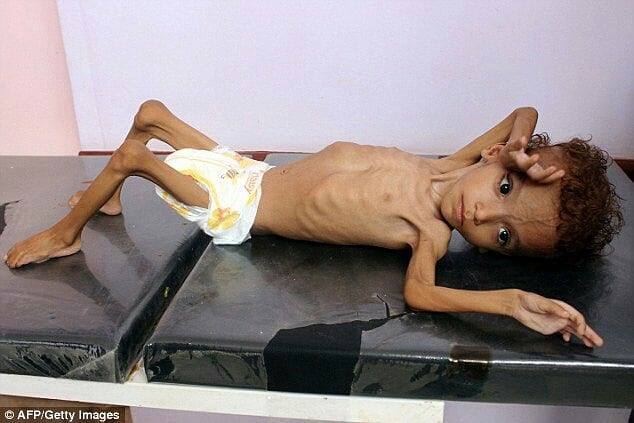 Des photos choquantes d'un enfant mal nourri montrent les effets brutaux de la guerre menée par la coalition Arabo-US contre le Yémen qui a laissé 17 millions de personnes affamées à mort. S'il vous plaît partagez !