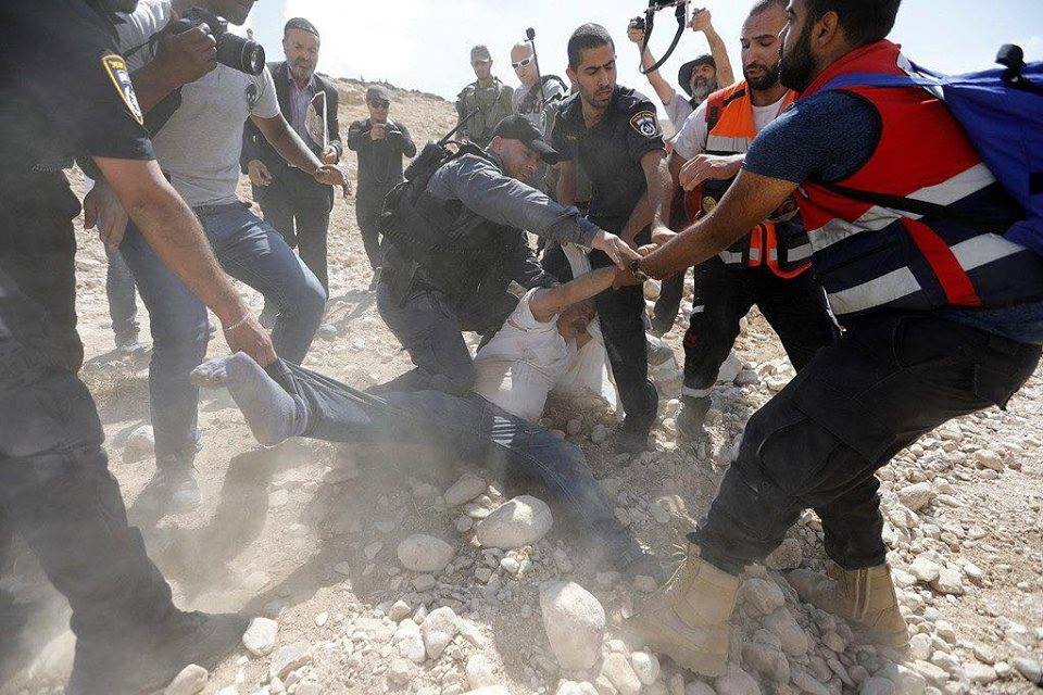 Brutalité sans relâche... Les forces d'occupation israéliennes agressent un vieil homme palestinien à l'extérieur du village de Khan Al-Ahmar, à l'est de Jérusalem, tout en protestant contre le plan d'Israël de démolir le village aujourd'hui.