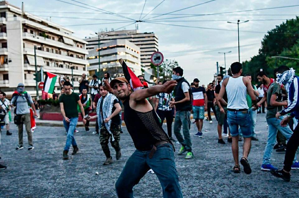 Ce ne sont pas des palestiniens. Ce sont des Grecs qui lancent des pierres vers l'ambassade d'Israël en Grèce pour protester contre le massacre israélien contre les palestiniens dans la bande de Gaza.