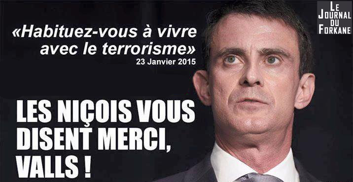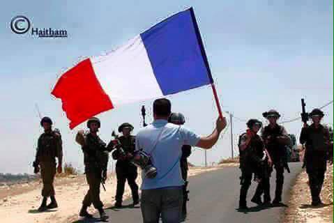Des participants à la manifestation hebdomadaire de BEL'IN contre l'occupation et l'Apartheid sioniste hissent un drapeau français en solidarité avec les victimes de l'attaque d'hier soir à Nice. La Manif et comme tous les vendredi, a été réprimée par les forces d'occupation sionistes.