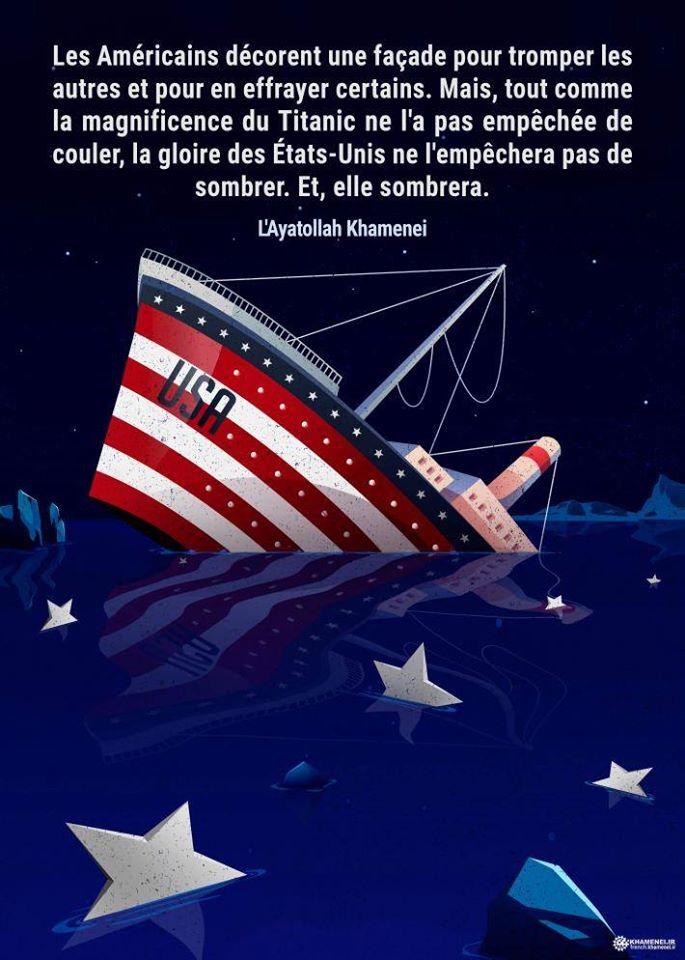 Les Américains décorent une façade pour tromper les autres et pour en effrayer certains. Mais, tout comme la magnificence du Titanic ne l'a pas empêchée de couler, la gloire des États-Unis ne l'empêchera pas de sombrer. Et, elle sombrera.