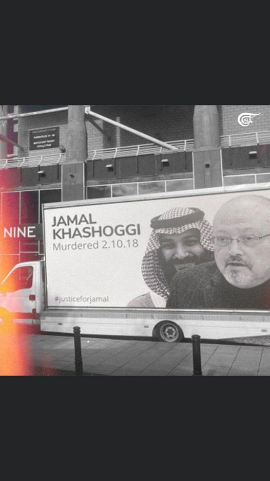 Ce poster à l’entrée du stade de Newcastle, club que les bouchers saoudiens veulent acheter, rappelle le meurtre atroce et le découpage en morceaux de Jamal Khashoggi.