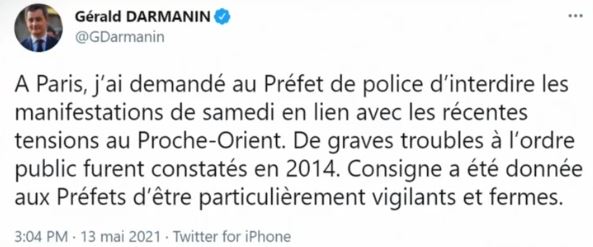 Dans un télégramme envoyé à l’ensemble des préfets Darmanin leur demande de « mobiliser les services de renseignement » pour « assurer le suivi de ces mouvements » des manifestations de soutien au peuple palestinien. »- et « ne pas hésiter » à « interdire » les manifestations si leurs déclarations sont « hors délai », représentent un risque de « troubles à l’ordre public » ou ne « respectent pas les règles de l’état d’urgence sanitaire ».