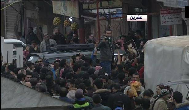Le drapeau syrien et des portraits du président al-Assad se lèvent dans la ville d’Afrin et la population se rassemble pour confirmer leur appartenance à la patrie Syrienne et ont salué l’implication des forces populaires face à l’attaque turque.