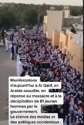 Manifestations d’aujourd’hui à Al Qatif, en Arabie saoudite, en réponse au massacre et à la décapitation de 81 jeunes hommes par le gouvernement saoudien. Le silence des médias et des politiques occidentaux!