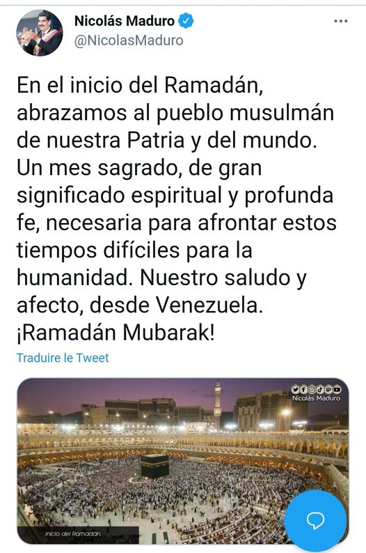 «En ce début de Ramadan nous embrassons le peuple musulman de notre patrie & du monde. Un mois sacré d’une grande signification spirituelle & d’une foi profonde nécessaire pour affronter ces temps difficiles pour l’humanité. Salutations & affection du Venezuela. Ramadan Mubarak!»