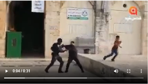 Palestine | Un soldat israélien terrorisant un père sans défense et son fils sans raison. Ils veulent effrayer les fidèles afin de donner aux colons sionistes provocateurs l’espace pour s’introduire dans la mosquée Al Aqsa.